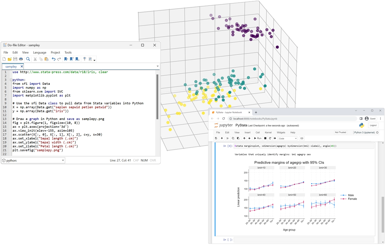 O Stata também tem o PyStata, que fornece integração abrangente com o Python, permitindo que você aproveite todo o poder do Python diretamente do seu código Stata e aproveite todo o poder do Stata do seu código Python.